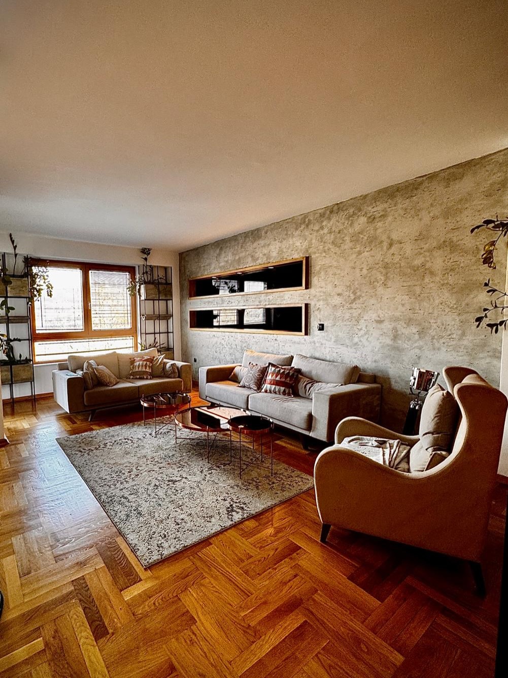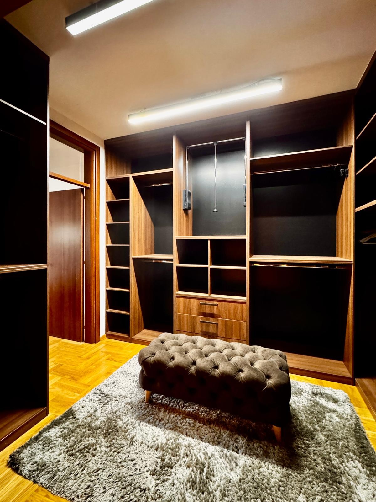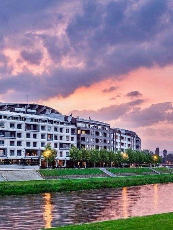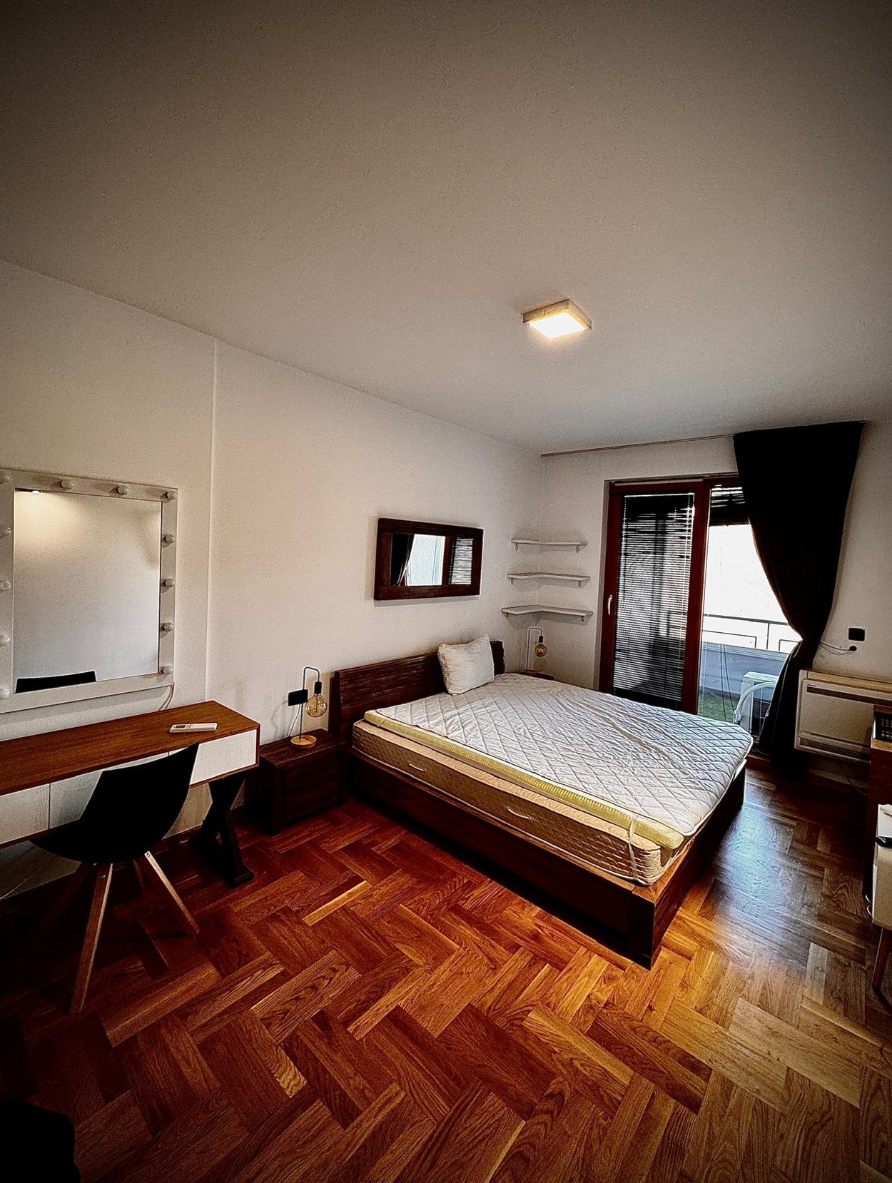An exclusive luxury apartment of 125 m² is available for rent on the 3rd floor in the Park Residence complex, offering a beautiful view of the Vardar River quay.